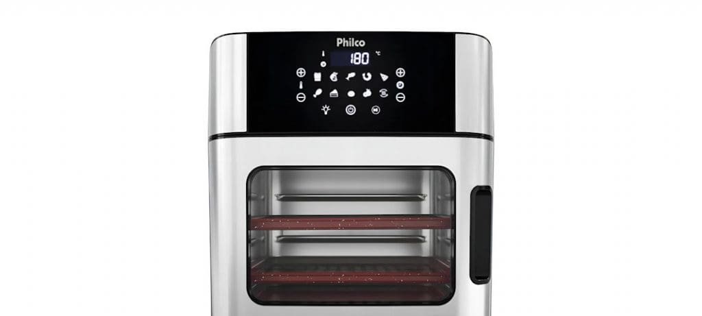O equipamento traz painel digital que reúne os comandos de tempo e temperatura, além de programas automáticos para fritar, assar, reaquecer ou desidratar. Ajustes manuais também estão disponíveis.