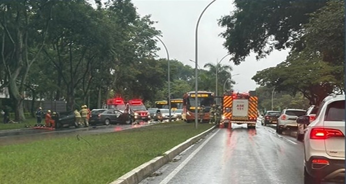 Colisão entre três veículos bloqueia Eixinho Sul e deixa dois feridos em Brasília