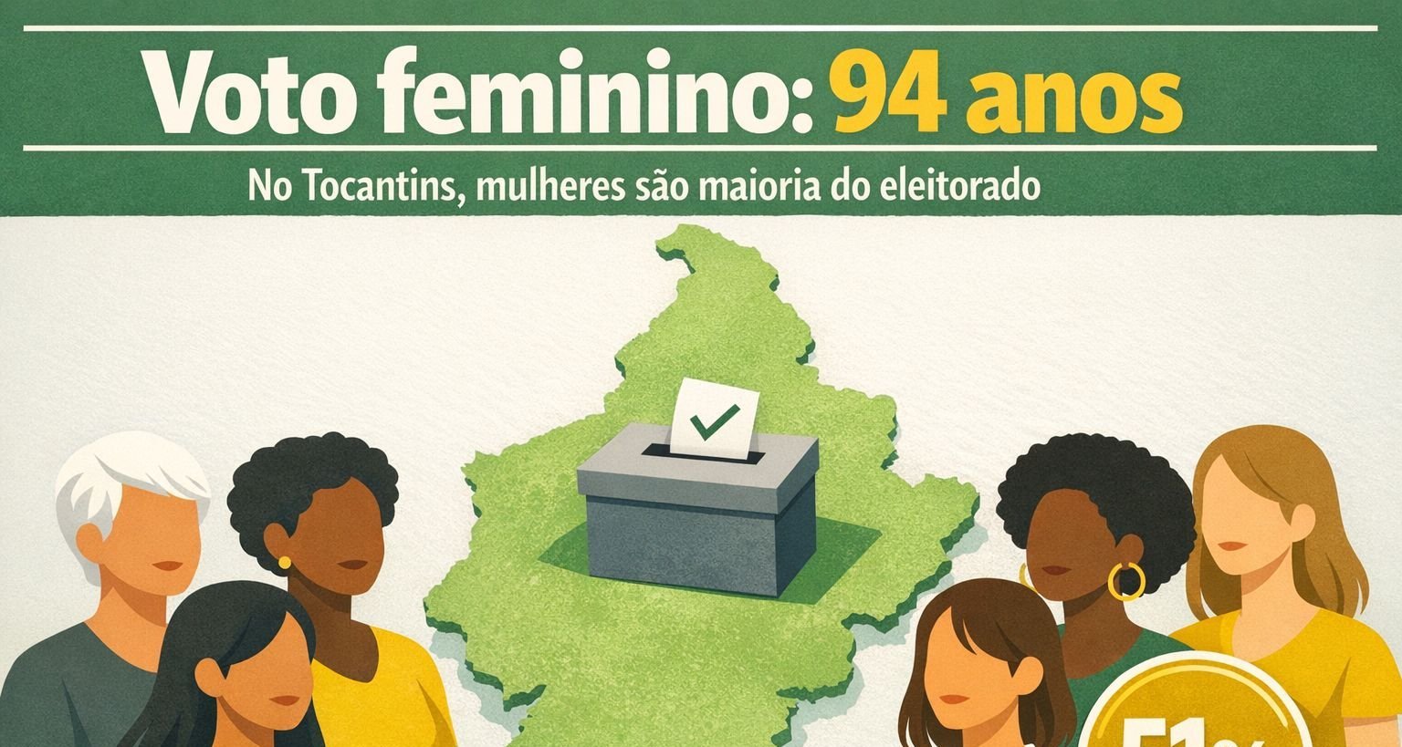 O Tocantins chega aos 94 anos do sufrágio feminino, comemorados nesta terça-feira (24), com predominância de mulheres nas urnas. Dados do Tribunal Regional Eleitoral (TRE-TO) apontam 588.478 eleitoras, o que representa 51% dos 1.155.015 votantes aptos no estado.